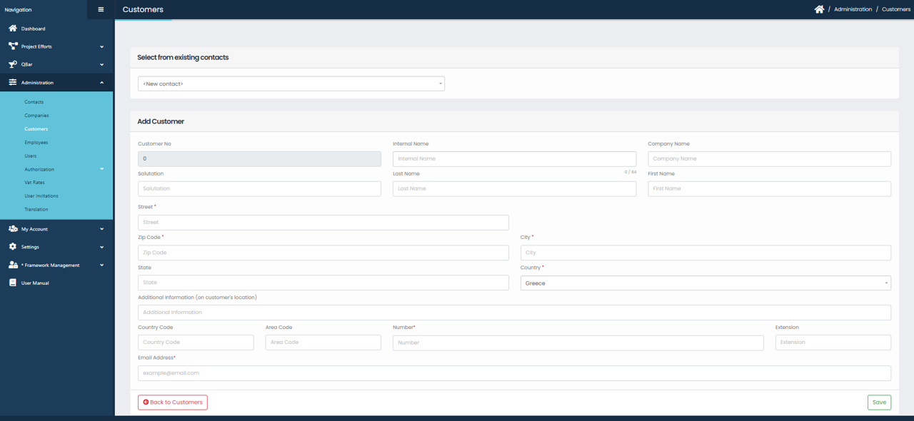 Once all necessary information has been filled in, click the Save button at the bottom right to create the customer. If you decide not to proceed, click Back to Customers to return to the Customers list without saving any changes.