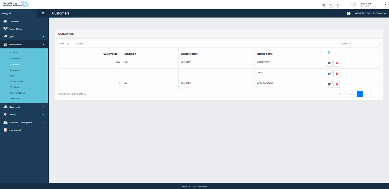 The Customers page displays a list of all customers currently registered in the system. Each entry includes key information such as the Customer No, Salutation, Customer Name, and Internal Name, allowing users to quickly identify and manage customer records.