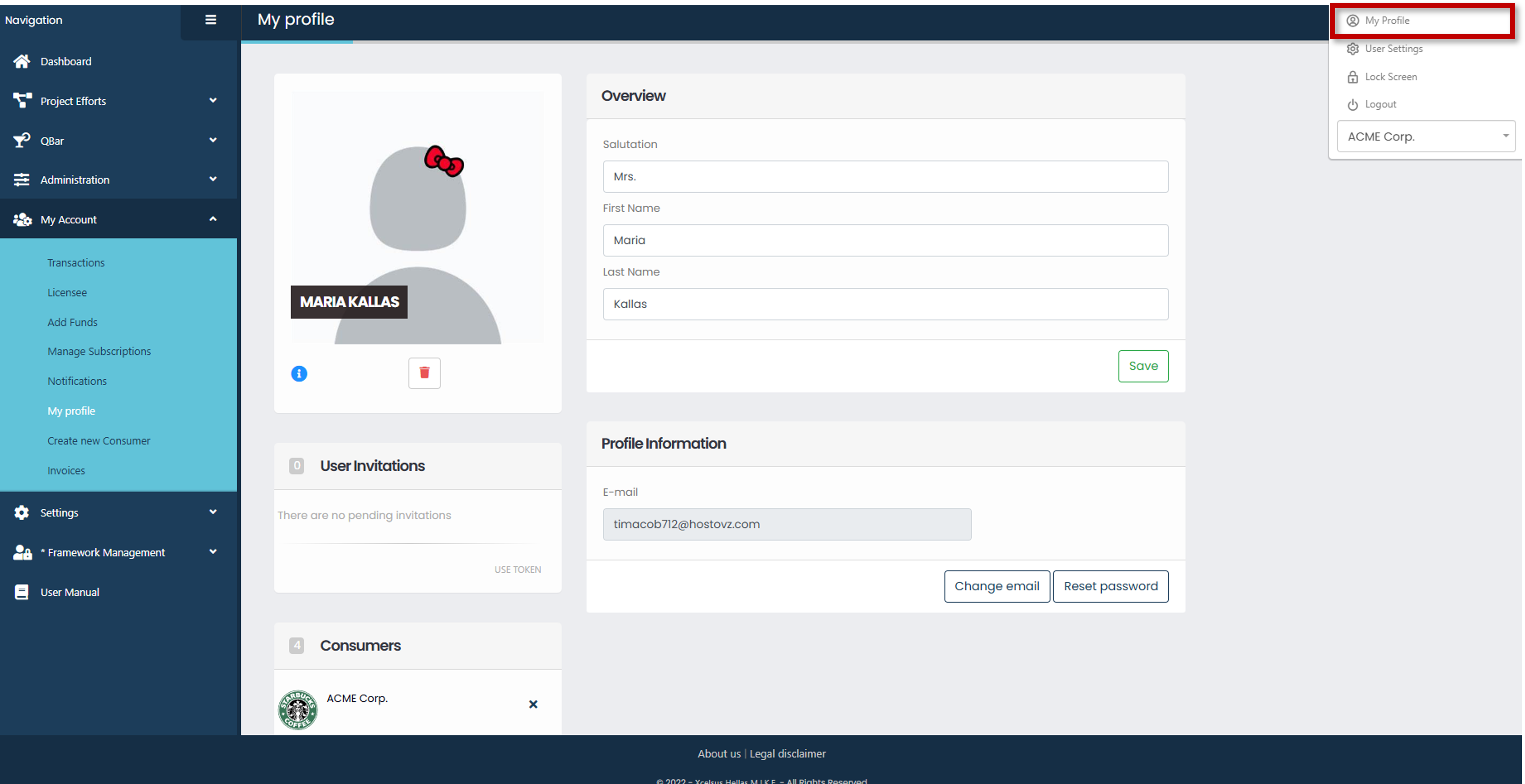 In “My profile” page, you are able to modify your overview information, upload a profile picture for your user, set your user’s email and have an overview of the connected consumers and the user invitations, user has received, as well. Do not forget to save your changes.