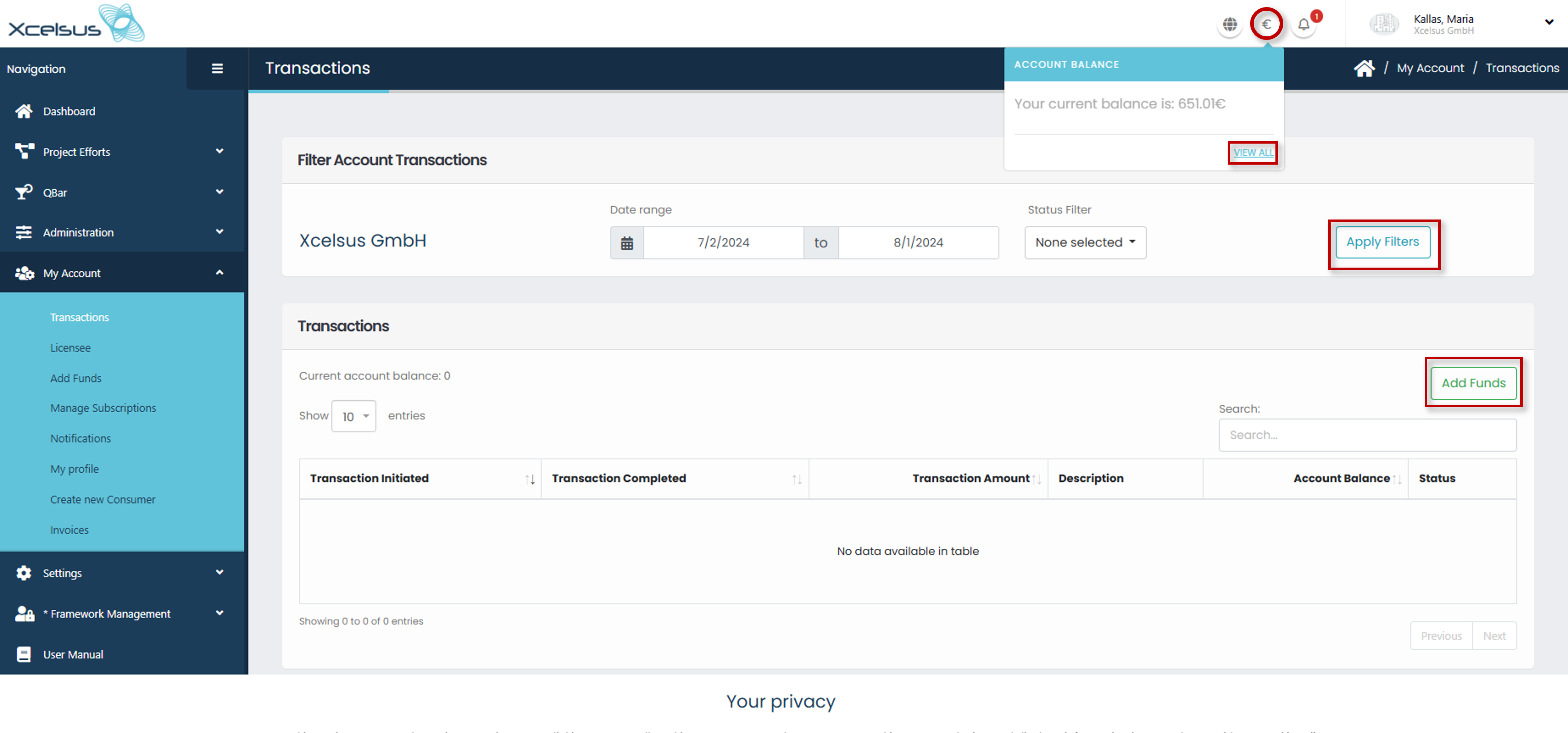 By clicking the euro symbol button you are able to see your account balance. When you click the “Add Funds”, a new view appears. There the user can set the desired date range and, after he clicks the “Apply filters”, he gets a detailed table with the following information: