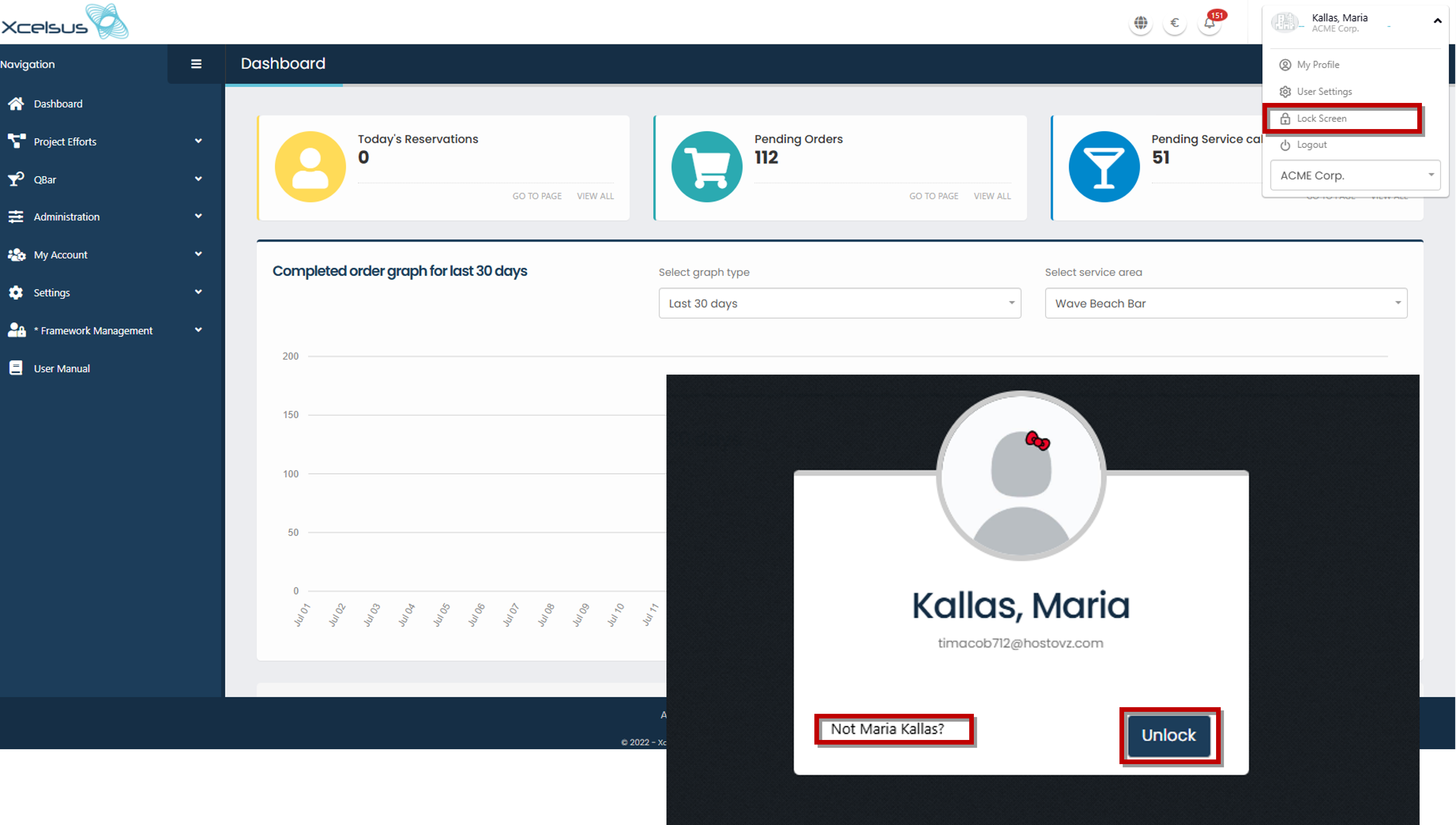 Lock screen tool: Click the “Unlock” button to to return to the previously viewed view. If you are not logged in with the right user, click the “Not (username)?” that leads you to the log in page, so you are able to log in with the user you need.