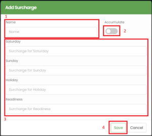 To edit a Surcharge, click the corresponding edit button and fill out the form that appears. Similarly to what happens when adding a surcharge, you will need a name (1) and at least one value (3) and you will be able to indicate if the surcharge accumulates and finally to save it.